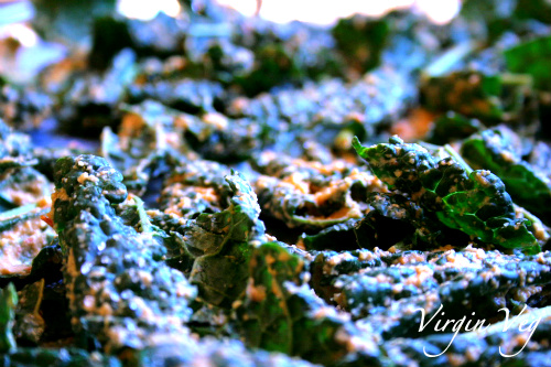 Pour the cashew sauce over kale and stir until coated. Place the kale chips on two cookie sheets and bake in a 175 degree oven for 3-4 hours or until crisp.